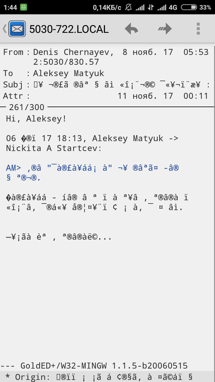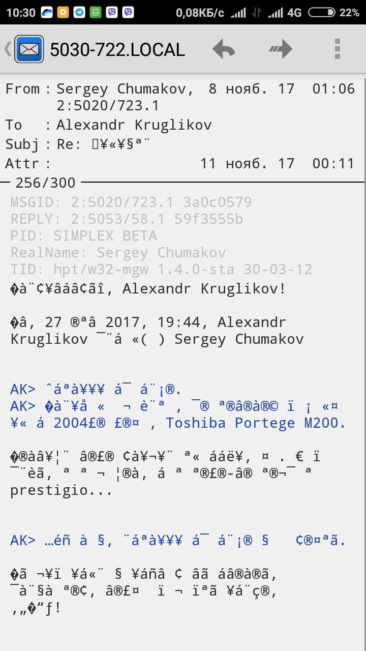 Hi, All! V. 1.6.6. have some problem with russian codepage. In settings - cp866... http://pics.rsh.ru/img/photo_2017-12-03_18-44-37_xu4h5qbh.jpg http://pics.rsh.ru/img/photo_2017-12-03_18-44-45_cog19jbn.jpg http://pics.rsh.ru/img/photo_2017-12-03_18-44-54_e8cl4vig.jpg http://pics.rsh.ru/img/photo_2017-12-03_18-45-00_xdxmjwew.jpg Live long and prosper, Sergey Chumakov ... .... линия отрыва ..... --- SimpleX 'Next' 0.49 рнале массаракш! (2:5020/723)* Origin: Веселые истории в ж |